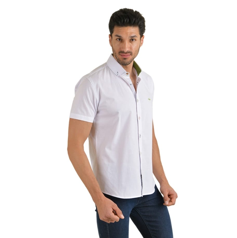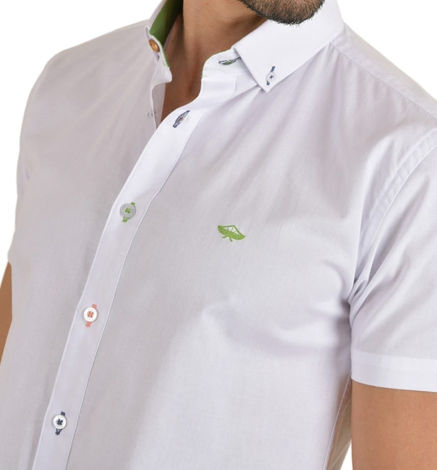 • Corte ligeramente ajustado, cuello abotonado, manga corta