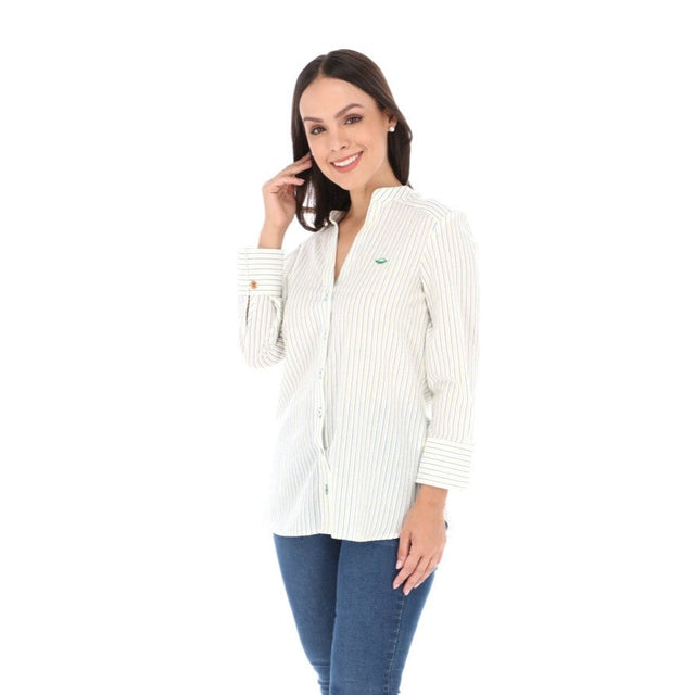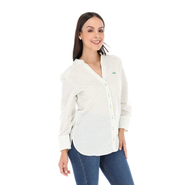 • Camisa para mujer, Corte regular (ligeramente amplio), Cuello mao, manga 3/4, Cierre frontal con botonadura