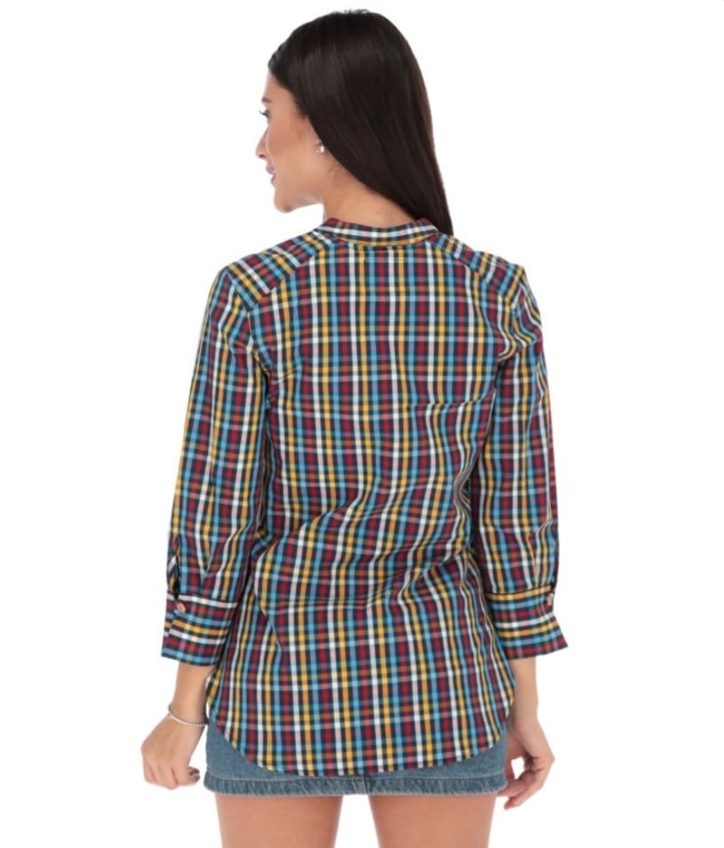 • Camisa mujer corte regular (ligeramente amplio), cuello mao, manga 3/4
