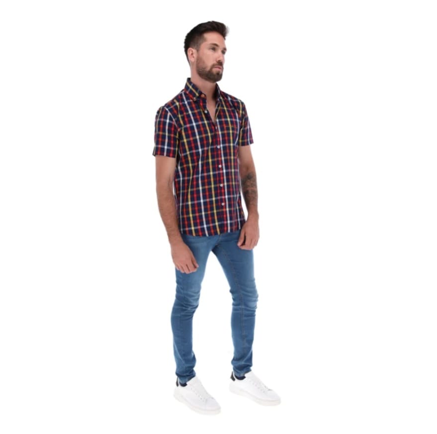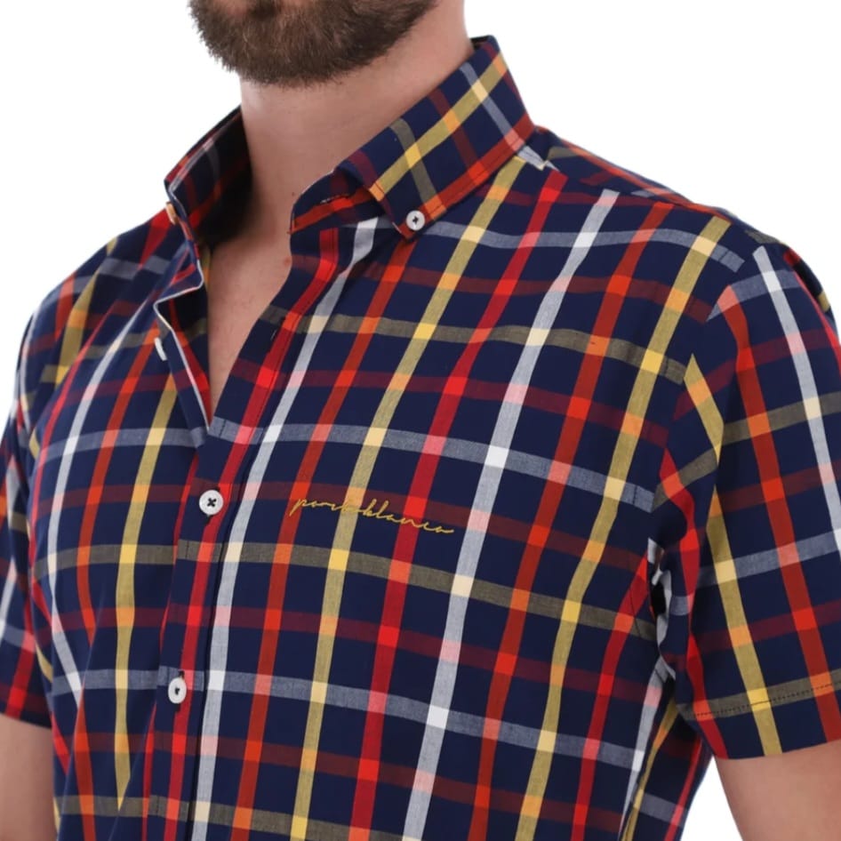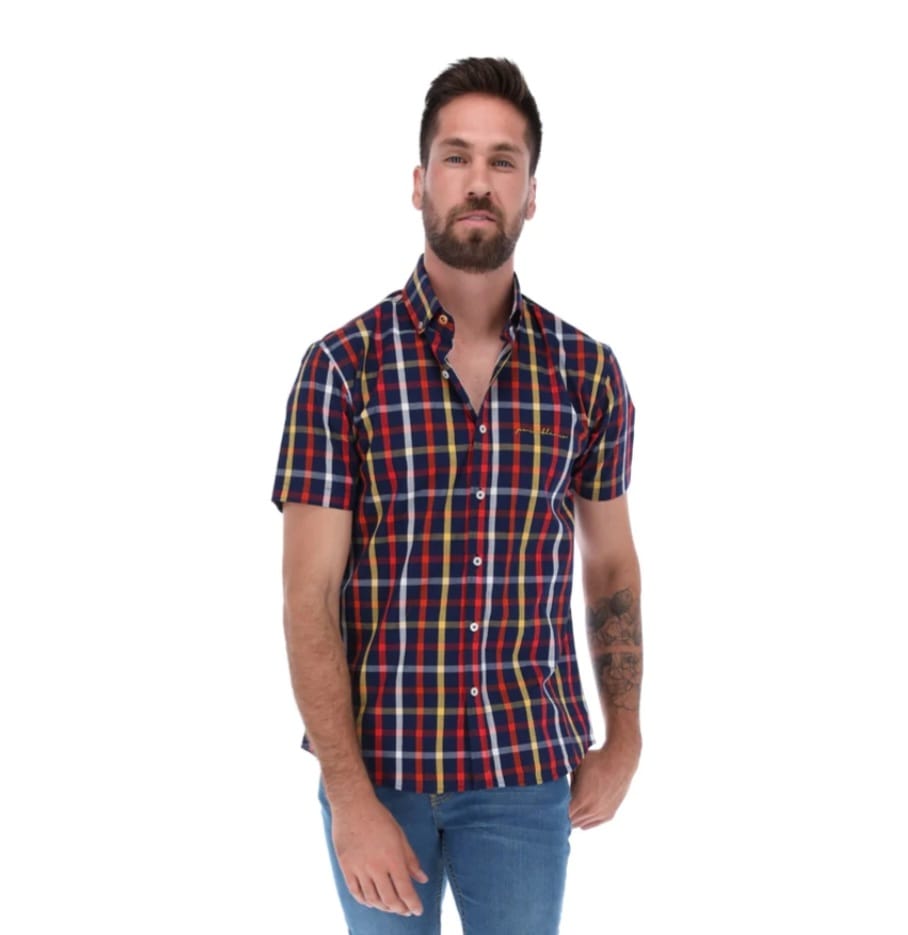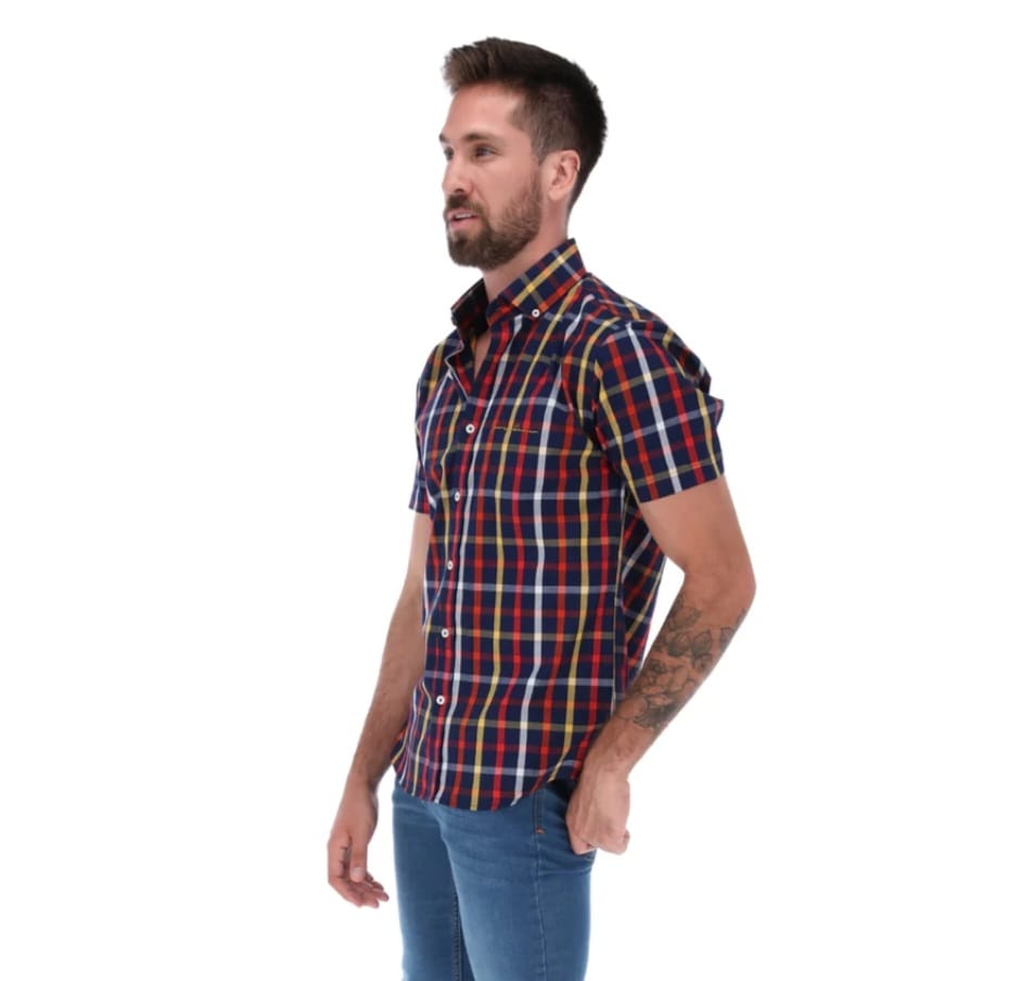 • Camisa Caballero Corte ligeramente ajustado, silueta intermedia entre regular y ajustado, Cuello button down, manga corta
