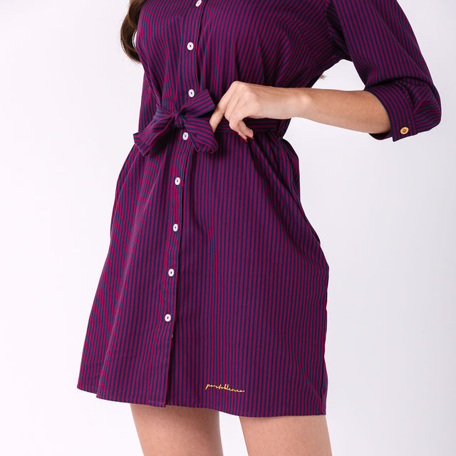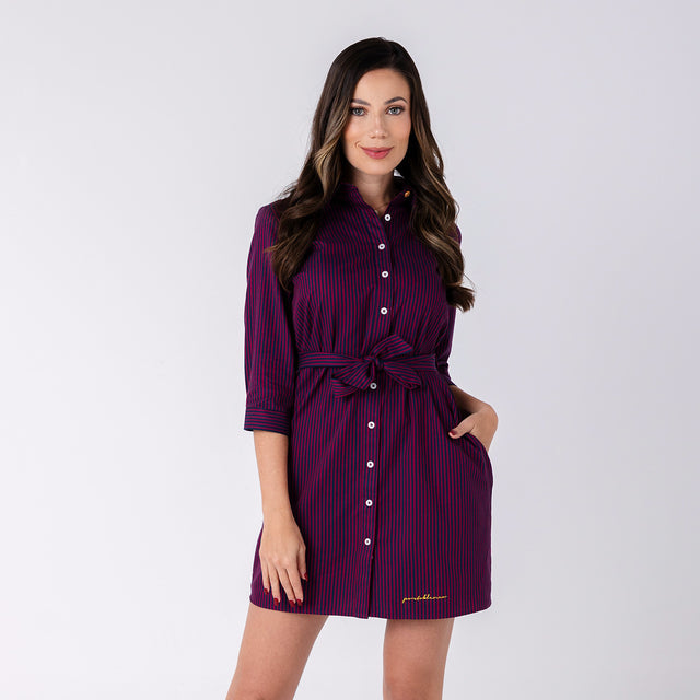 Elegante y versátil, nuestro vestido camisero a rayas azul marino y tinto es la elección perfecta para cualquier mujer. Su corte favorecedor y manga 3/4 lo hacen ideal para cualquier estación del año.