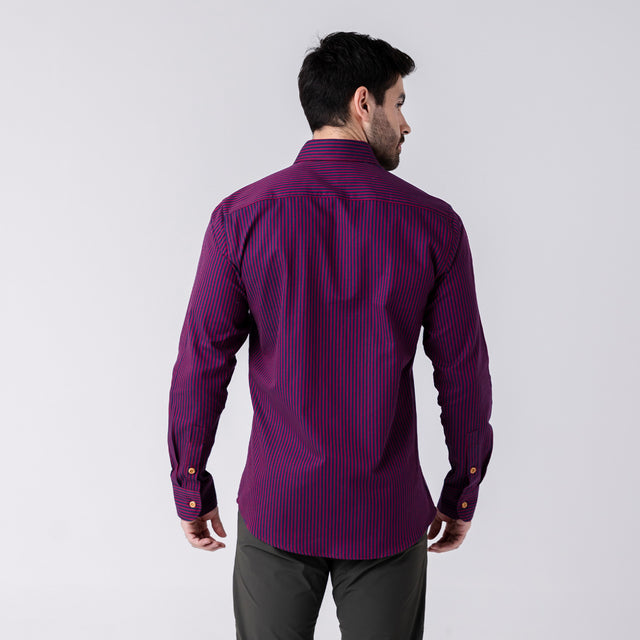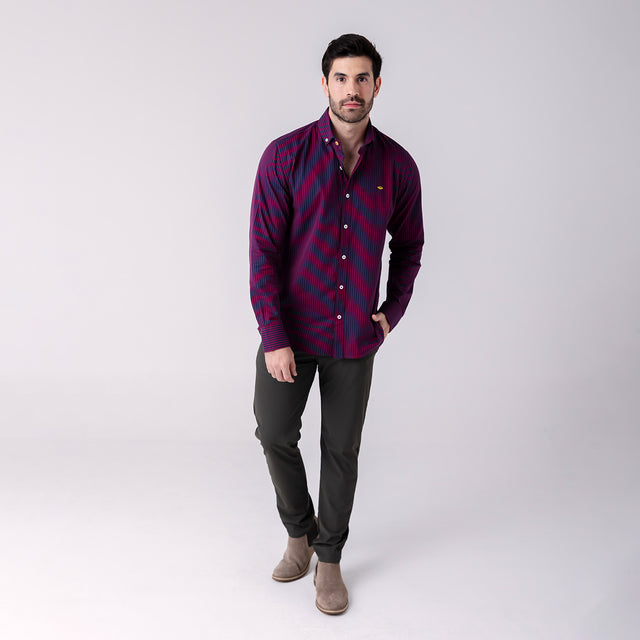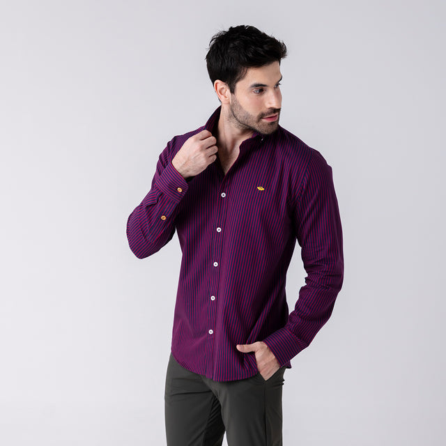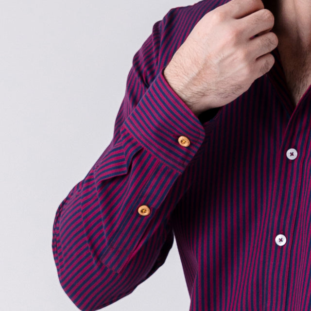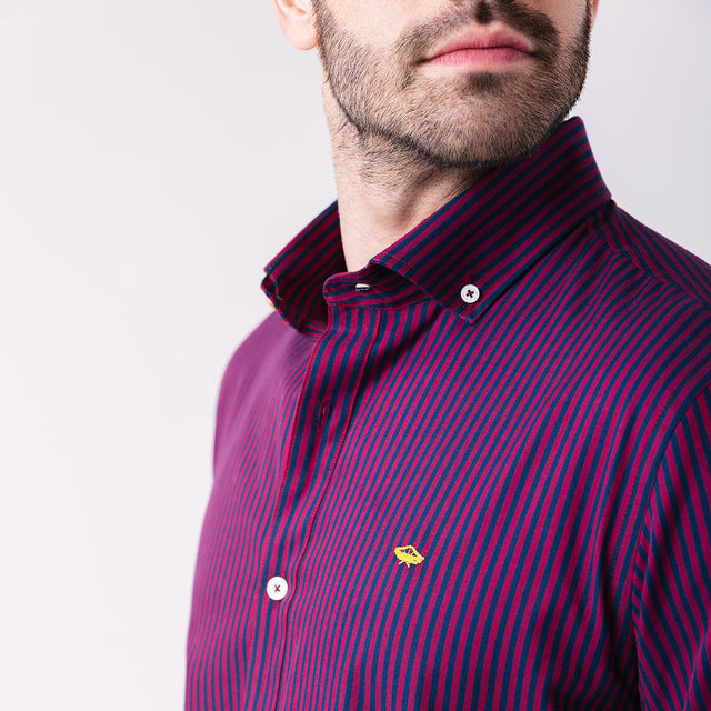Nuestra camisa a rayas de algodón es el complemento perfecto para cualquier armario joven. Con su corte moderno y cómodo, y un diseño de rayas clásicas en tonos azul marino y tinto, esta camisa te permitirá crear looks casuales y sofisticados.