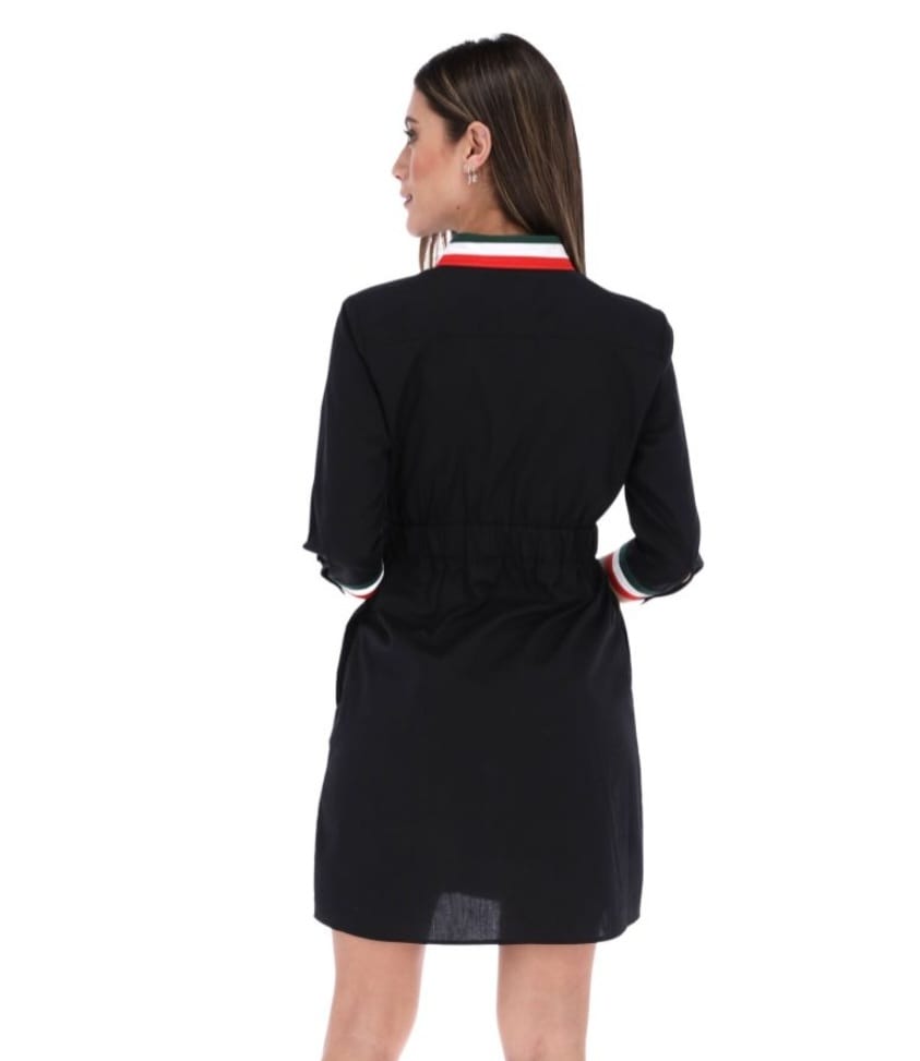 • Vestido corte A (silueta relajada), cuello solapa, manga 3/4