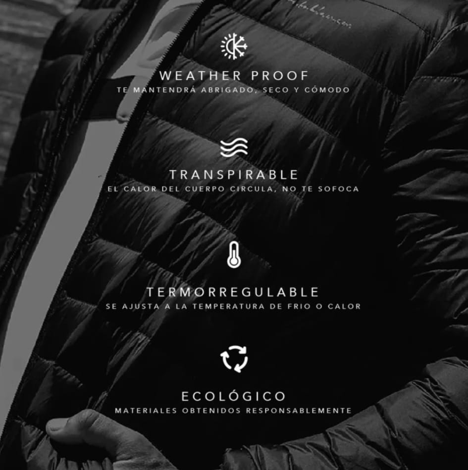 • Chamarra ultraligera de pluma de ganso, ideal para climas con vientos, lloviznas, humedad, distintos grados de calor, o frío